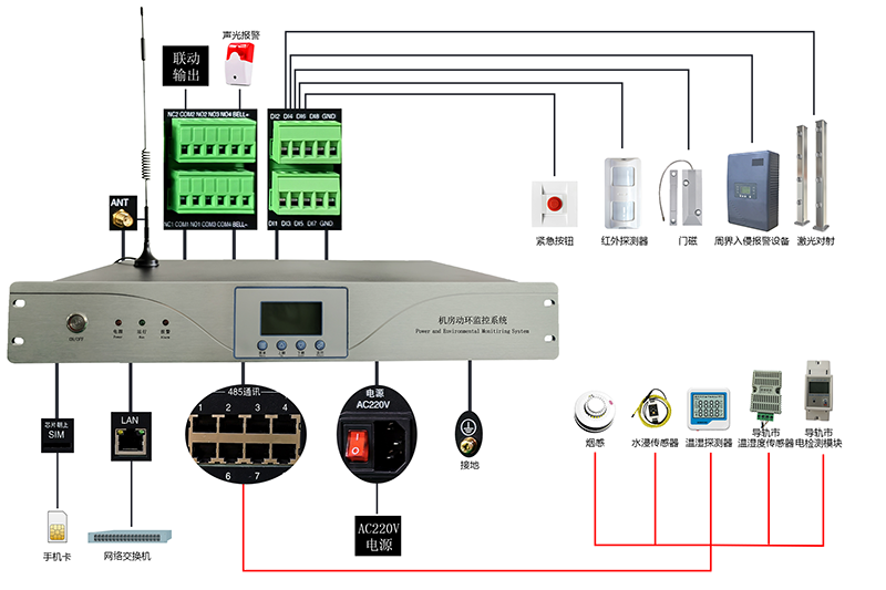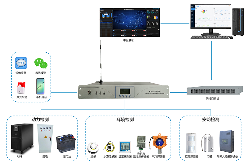 動環主機是一款集動力環境監控功能及入侵防盜報(bào)警於(yú)一體的設備,可實時監測機房、基站等場所的動力設備運行狀态、環境參數、入侵報(bào)警,如市電、UPS、蓄電池、溫濕度、煙霧 、漏水、門禁