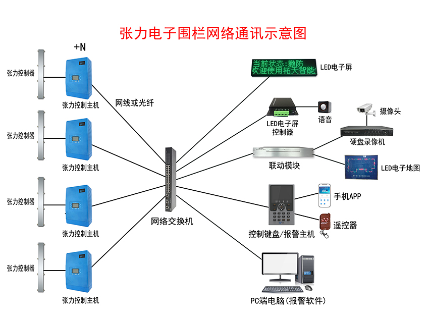 張力電(diàn)子圍欄報(bào)警系統示意圖——網絡(luò)通訊+LED電(diàn)子屏+語音